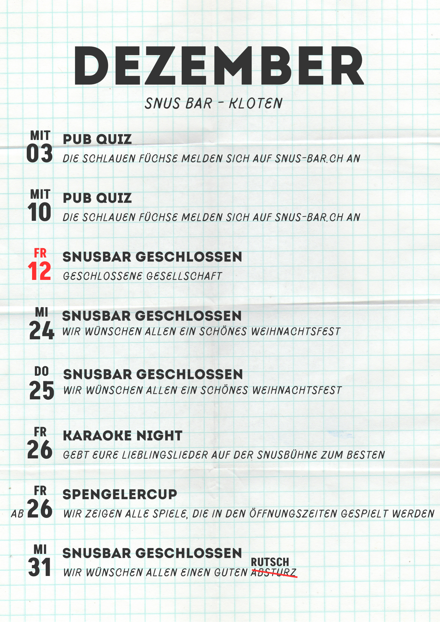 Kontakt EventJa, das ist möglich. Leider können wir am Wochenende keine geschlossene Gesellschaft anbieten, aber ab 50 Personen können wir einen Teil der Snus Bar für euch reservieren. Wende dich bitte direkt an uns per Mail an info@snus-bar.ch