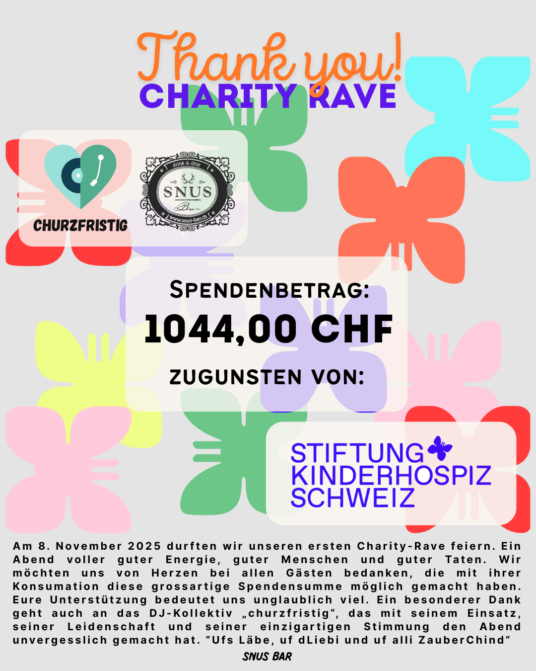 Am 8. November 2025 durften wir unseren ersten Charity-Rave feiern. Ein Abend voller guter Energie, guter Menschen und guter Taten. Wir möchten uns von Herzen bei allen Gästen bedanken, die mit ihrer Konsumation diese grossartige Spendensumme von 1044.- Franken möglich gemacht haben. Eure Unterstützung bedeutet uns unglaublich viel. Ein besonderer Dank geht auch an das DJ-Kollektiv „churzfristig“, das mit seinem Einsatz, seiner Leidenschaft und seiner einzigartigen Stimmung den Abend unvergesslich gemacht hat. “Ufs Läbe, uf dLiebi und uf alli ZauberChind”