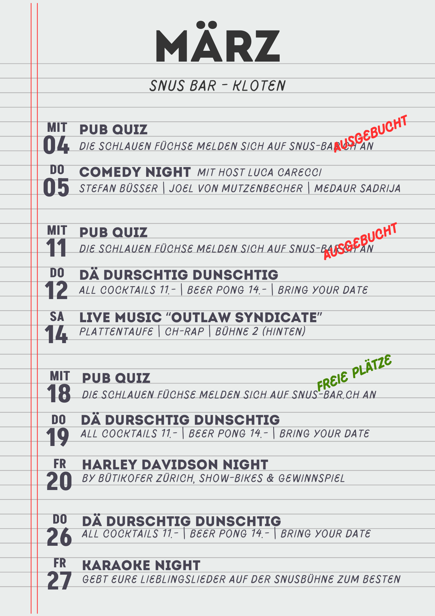 Die heimlichen drei Freuden auf Muttererde vereint an einem Ort, Bier, Burgers und Hockey. Wir zeigen euch jedes Spiel des EHC Kloten "live", egal ob Heim oder Auswärts, einzige Einschränkung ist, dass wir ab und zu Events haben die mit sich bringen, dass das Spiel nur auf einem anstatt zwei Screens gezeigt werden kann.